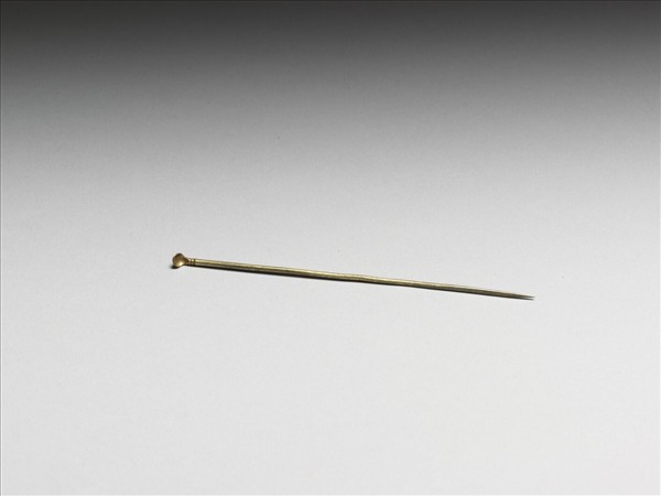 銀鍍金耳挖簪,簪首做小圓匙形,可用來掏耳;圓挺細而光素,末段扁,尾端尖,方便佩帶。故雜6377~6379共儲於一包。