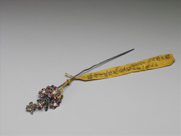 銀簪,簪首做花束狀,旁襯綠葉,以鍍金座嵌紅色、綠色、透明玻璃而成;銀挺,末端尖。有黃籤,一面寫:「咸豐三年正月二十日收平順交」,一面寫:「銀西洋玻璃花簪一對/嵌有底半元正珠六顆/共重八錢五分」,此器與故雜6381為一對。