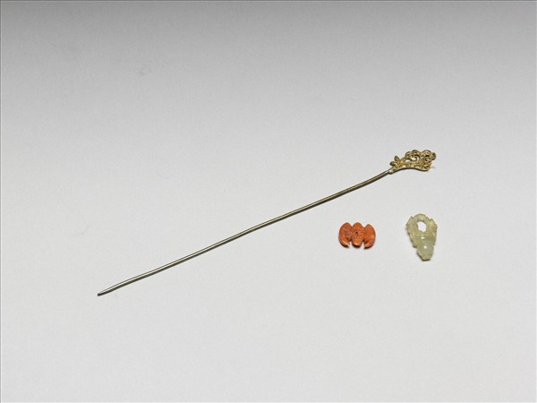 簪,簪首為鍍金靈芝形,飾白色硝石花籃及珊瑚蝙蝠,銀圓挺光素。有黃色包裝紙寫有:「嘉慶十三年五月二十六日收/銀鍍金硝石花籃簪一對」。此器與故雜6386為一對。