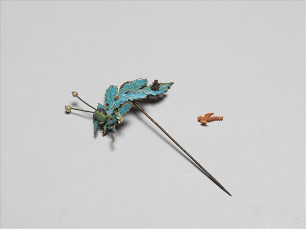 髮簪,點翠葉片簪首上有各色寶石、點翠或玻璃做成的青蛙、蛇、壁虎等動物;簪挺圓而光素,末端尖。應與故雜6404為一對。