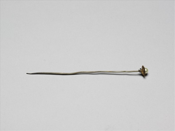 珍珠花簪,銀質,簪頂為鍍金朵花,花芯處鑲珍珠一顆,外圈滿佈細小花瓣,設計簡單典雅。