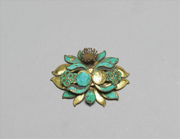 蓮形,紋飾左右對稱,分上下兩層,上層為點翠蓮蓬、蓮子、與蓮瓣;下層滿佈點翠與鍍金蓮瓣;中線一端貼一顆金屬珠花。