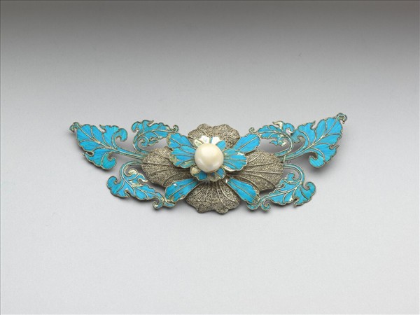 長方形,兩側出點翠葉數片,正中葵花一朵,纍絲花瓣,間點翠花蒂,點翠花心嵌東珠一。黃籤:嘉慶八年六月二十八日收敬事房呈。
