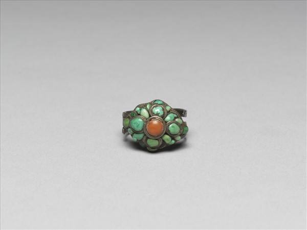 環形戒,銀質,戒面正中鑲圓形珊瑚一顆,其外鑲綠松石數顆,寶石排列方式似花,由中央往周圍擴散綻放之感,鑲嵌處與戒面周圍皆鏨刻連珠紋;戒圍以兩股銀片交繞而成,大小可調整。故雜6411~6418為八件一組。