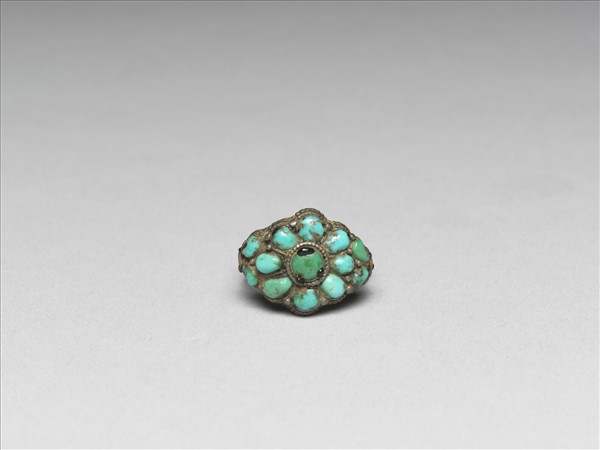 環形戒,銀質,戒面中央鑲圓形綠松石一顆,周圍以放射狀鑲嵌八顆水滴型松石,排列方式似一朵小花,戒面兩側另鑲兩顆松石與一顆珊瑚,鑲嵌處與戒面周圍皆鏨刻連珠紋;戒圍以兩股銀片交繞而成,大小可調整。故雜6411~6418為八件一組。