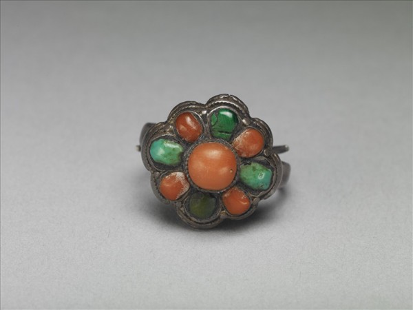 環形戒,銀質,戒面中央鑲圓形珊瑚一顆,周圍以放射狀鑲嵌八顆橢圓松石及珊瑚,排列方式似一朵八瓣小花;鑲嵌處與戒面周圍皆鏨刻連珠紋;戒圍以兩股銀片交繞而成,大小可調整。故雜6411~6418為八件一組。