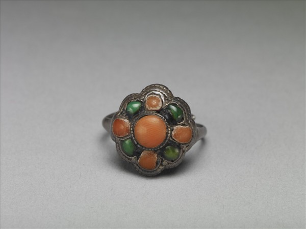 環形戒,銀質,戒面中央鑲圓形珊瑚一顆,周圍以放射狀鑲嵌八顆橢圓松石及珊瑚,排列方式似一朵八瓣小花;鑲嵌處與戒面周圍皆鏨刻連珠紋;戒圍以兩股銀片交繞而成,大小可調整。故雜6411~6418為八件一組。