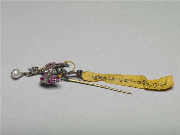 銀直簪,簪首為飛蛇形,滿佈鑲嵌之透明、綠色、及粉紅色玻璃珠,於蛇口處穿一珍珠墜,簪首以鐵線綑綁於挺,素挺。