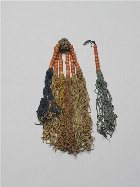 珊瑚垂墜耳飾,環部為銀質鏤空球形,球頂及底皆出纍絲蓮瓣紋,球身環繞連珠葉紋,葉內接漩渦紋;墜部垂七條流蘇,以棉線綑綁於環底的穿孔上,每條流蘇串八顆珊瑚珠,下垂與數十條棉繩,棉繩顏色共有褐色、墨綠與深藍。此器與故雜6440為一對。