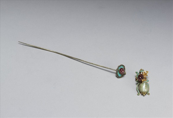 銀鍍金簪,簪首為點翠朵雲紋,中心嵌紅寶石,素挺;另有一配飾,串紅寶石與珍珠,旁飾點翠綬帶,與簪首未知有無從屬關係。此器與故雜6451為一對。