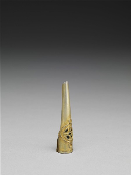 銀質鍍金指甲套,由基底往指尖漸細,基部面飾一古錢紋,外另飾四個圓圈,紋飾上皆鏨刻出繩紋。此器與故雜6463為一對。
