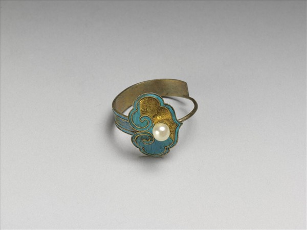 環形,應為耳環,銀質鍍金,有開口,環身三分之二滿飾點翠,其餘部分為細鈎,兩末端未接合,交接處以銅線綁一點翠雲頭紋,雙金線描邊,正中貼一珍珠。此器與故雜6465為一對。