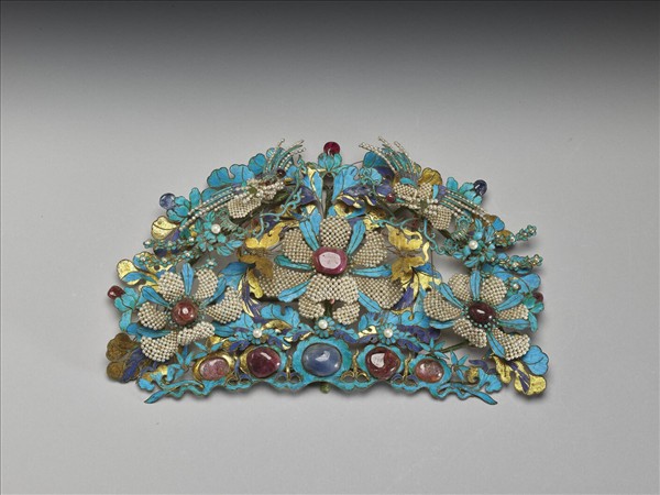 略呈半圓,銀質鍍金,主要紋飾為中央的三朵牡丹,花中央嵌紅寶石與點翠花蕊,緝米珠花瓣,瓣間出點翠葉,花間嵌纍絲鳳蝶各一;下緣以點翠花形為基座,鑲五顆紅色、藍色寶石,隙地飾點翠米珠花卉與點翠葉。整器以銀線綑綁組合成器,紋飾繁複細密。