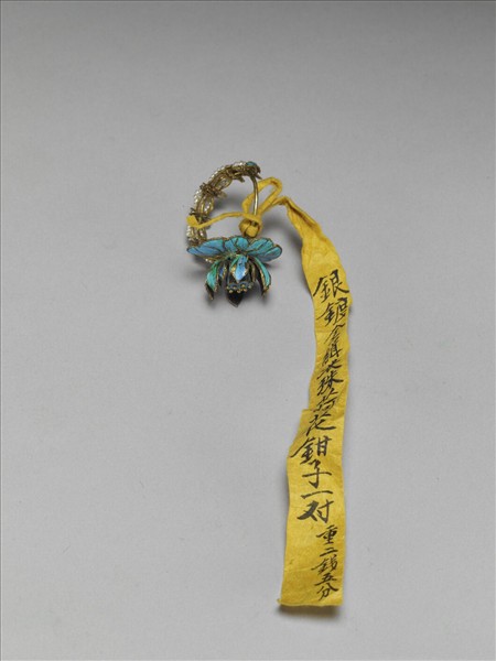 環形,有開口,銀鍍金,環身以米珠及點翠裝飾成蓮藕,環上串一點翠立體蓮花,花中一蓮蓬,上有金珠蓮子。此器與故雜6479為一對。