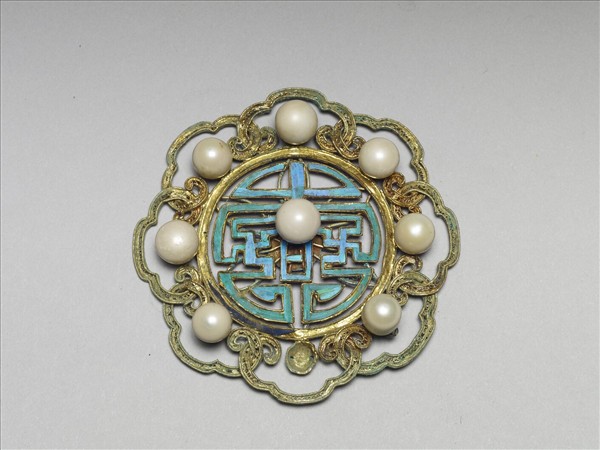 團形,銀鍍金,中央一點翠團壽與卍字二,上嵌一珍珠,壽字外環繞八個纍絲雲頭紋,彼此相勾連,每朵雲紋亦嵌珍珠。