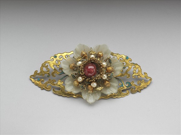 眼形,中央為一七瓣花卉,以硝石雕刻而成,花瓣微凹;花芯紋飾複雜,珠花蕊,內嵌一紅寶石,外為點翠勾雲與珍珠相間,亦飾葉紋與小果實;花卉兩側延伸點翠流雲。