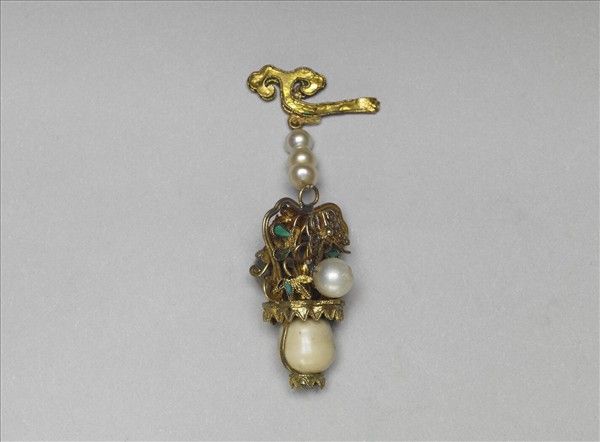 簪首為點翠靈芝,下懸花籃一,籃與首間貫珍珠三,花籃兩側嵌珍珠與紅寶石,籃底一圈點翠如意鉤連,其下嵌一東珠,兩旁點翠綬帶;挺部斷裂。故雜6493~6496為四件一組。