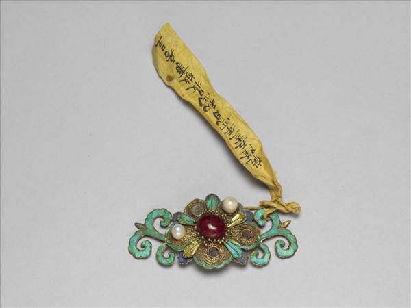 紋飾對稱,中心纍絲梅花,花心鑲紅寶石,並出珠花蕊,瓣緣點翠,每瓣皆嵌珍珠一顆,瓣間出點翠葉;花兩側延伸出點翠捲葉紋。