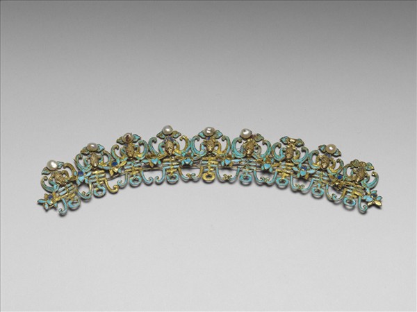 拱形,器身滿飾點翠蝠壽紋共九組,壽字上方為蝙蝠,頭部朝下,尾端嵌珍珠,珍珠兩側飾點翠雲桃紋。