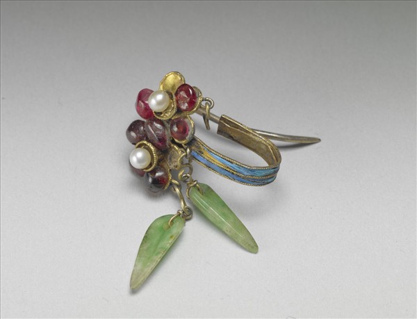 花卉耳飾,環部梅花二,花瓣嵌紅寶石,花芯嵌珍珠,花下垂翡翠葉,花後為一點翠U形鉤,與金屬彎鉤。此器與故雜6513為一對。