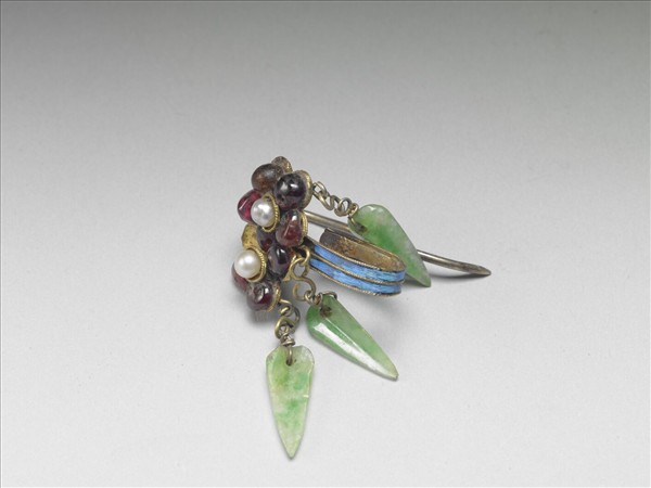 花卉耳飾,環部梅花二,花瓣嵌紅寶石,花芯嵌珍珠,花下共垂三片翡翠葉,花後為一點翠U形鉤,與金屬彎鉤。此器與故雜6512為一對。