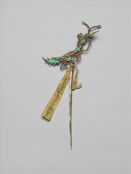 龍形簪,銀鍍金,簪首為行龍,翡翠龍身,鍍金背鬚,周圍飾數個點翠十字雲紋,尾部亦點翠,龍首附近一嵌珠點翠雲紋;龍首出兩條纍絲觸鬚,尾端串珍珠各一,龍腳為彈簧銅線;簪首以銅線綑綁於挺,挺上錘鍱出戳記「祥和」二字。