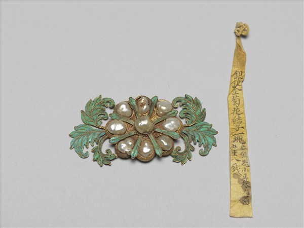 略呈長方形,紋飾左右對稱,中央為纍絲菊花,花瓣與芯各鑲嵌珍珠,共九顆;瓣間出點翠花蕊,菊花兩側各延伸三片卷葉,並以纍絲描繪葉脈紋理。