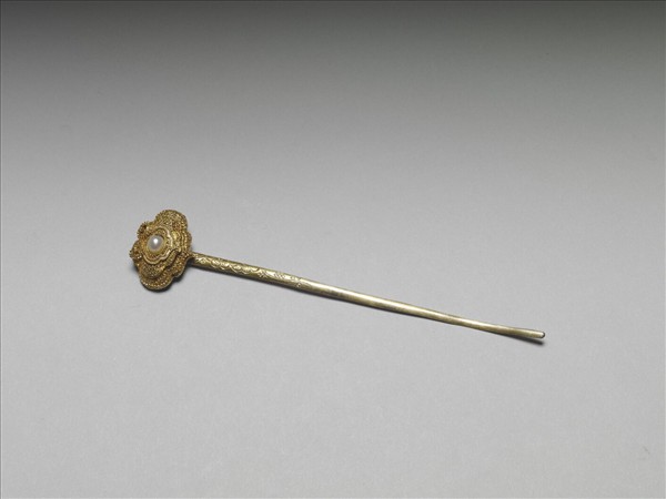 鍍金簪,纍絲如意簪首,以層層推疊方式組成立體雲紋,中心鑲珍珠一顆,雲背中空,直鋌,鋌上鏨刻花瓣紋。此器與故雜6541為一對。