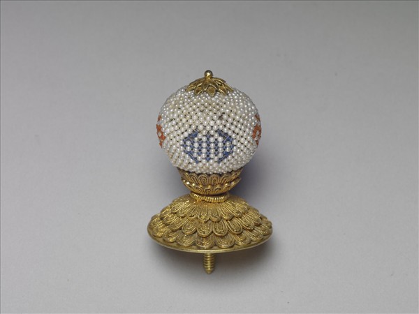 銀鍍金起花座,上嵌緝米珠圓球,圓球以白色米珠為地,間以珊瑚米珠砌成卍字、蝙蝠紋,又以藍色米珠緝成壽字。