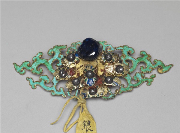 結子以點翠流雲為地,中間為團花,並嵌藍寶石與玻璃,花芯亦嵌小顆藍寶石。