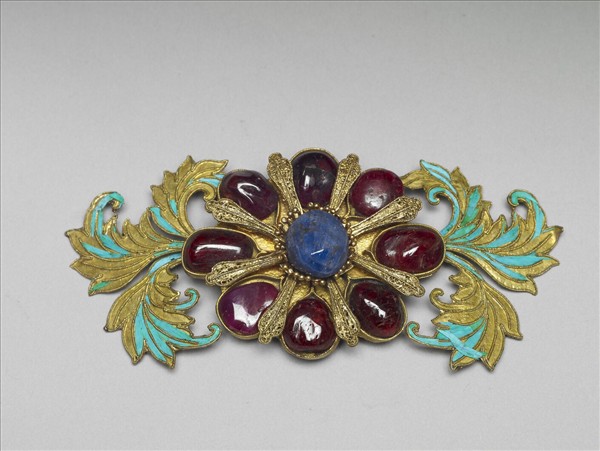 略呈長方,中為一鍍金八瓣菊花,花瓣嵌紅寶石,花芯鑲藍寶石,周圍出珠花;瓣間出纍絲花蕊,菊花兩側延伸點翠捲葉,紋飾左右對稱。