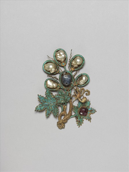 松鼠葡萄簪,葉面以點翠為飾,右側葉紋上鑲紅寶石一,六顆果實則為以點翠為襯,上嵌珍珠與藍寶石,旁有一松鼠。此器與故雜6574為一對。