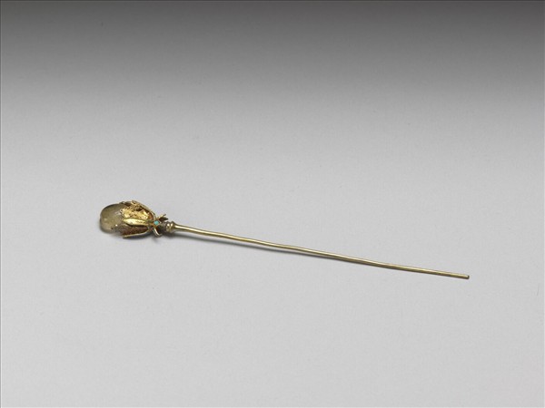 直簪,簪首花蕾形,點翠花萼,纍絲葉紋,內鑲碧璽一,素挺。故雜6575~6580為六支一組。