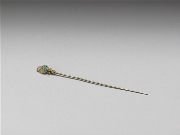 直簪,簪首花蕾形,點翠花萼與葉紋,內鑲碧璽一,素挺。故雜6575~6580為六支一組。