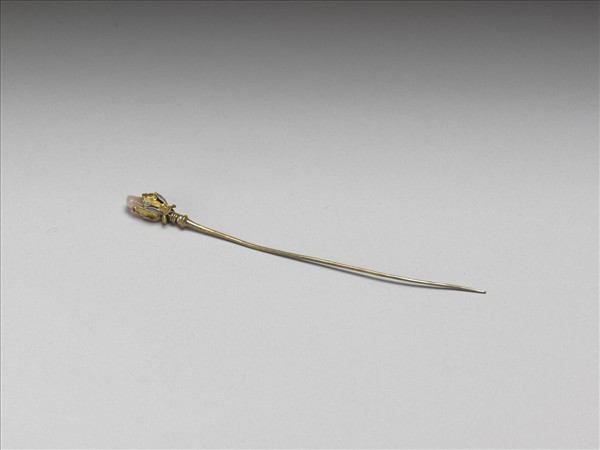 直簪,簪首花蕾形,點翠花萼與葉紋,內鑲碧璽一,素挺。故雜6575~6580為六支一組。