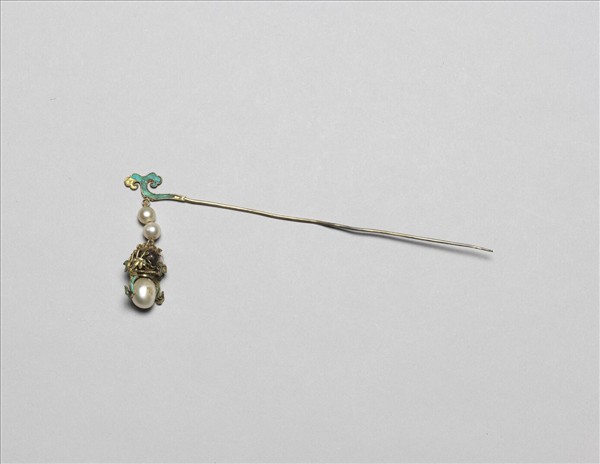 流蘇簪,簪首為點翠勾雲紋,下懸花籃一,籃與首間貫珍珠二,花籃兩側嵌紅、黑玻璃珠,與點翠竹葉紋,籃底嵌珍珠一,兩旁點翠綬帶;素直挺。此器與故雜6587為一對。
