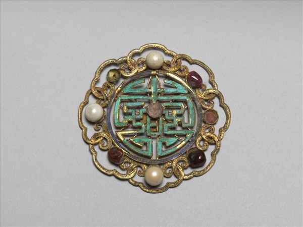 銀鍍金萬壽如意團形簪花,中央一點翠團壽與卍字二,上嵌一珍珠,壽字外環繞八個相連纍絲如意雲頭紋,其上紅寶石與珍珠間鑲。故雜6588~6590為三件一組。