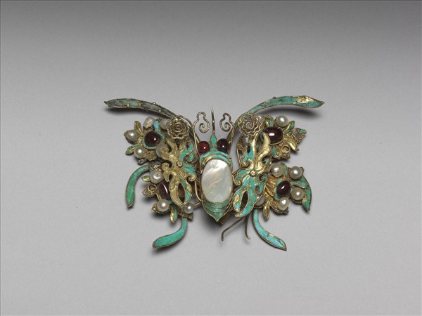 蝶形,蝶身嵌蚌蛤一,首尾點翠,雙眼鑲紅寶石,雙翅以點翠、紅寶、珍珠間飾,纍絲觸鬚,上嵌東珠。