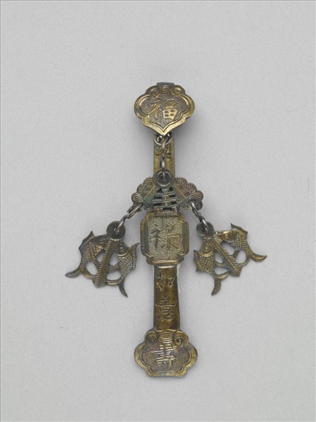 三鑲式如意,金屬質,外鍍金。趾作如意雲頭紋,腹部作四方開光,並各鐫刻「福」、「祿」、「壽」字,有魚子地,首串兩片雙魚墜飾,中間以「吉」字作區隔。器柄分上下段鐫刻「年年如意」四字吉祥用語。