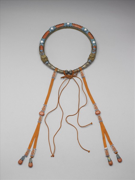 圓形項圈,金托,上嵌珊瑚六段,間以點翠金片五片,上嵌半珠各一,兩端飾金纍絲點翠龍首,末二段金軸於懸戴時可向外打開。每端各垂金黃縧二,中飾珊瑚結一,末各飾珊瑚墜角一,縧上飾紅白藍米珠喜字各五組。