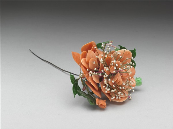 珊瑚重瓣花朵,米珠為蕊,翠玉蕾及葉,點翠銀座。素挺。