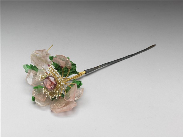 簪子,簪首作花蝶形,以翠玉雕成花葉,碧璽雕成花瓣,蕊心穿繫米珠,中心鑲一紅色寶石作蕾。素挺。
