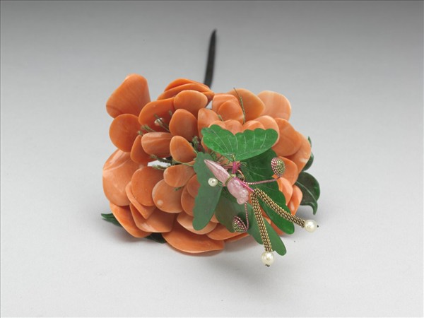 簪子,簪首作花朵形,以翠玉雕成花葉,鍍金花托點翠為飾,珊瑚雕成花瓣,蕊心纍絲穿繫蝴蝶,以碧璽雕作蝶身,翠玉雕成蝶翼,觸鬚纍絲並繫米珠。素挺,挺上有二戳記「寶華」 、「足紋」。此件部分脫落。