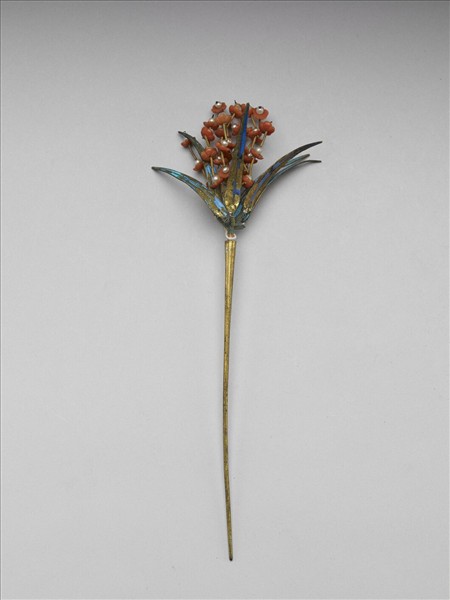 簪子,簪首作梅竹形,金屬片飾點翠作為竹葉,珊瑚雕作梅花,蕊心穿繫米珠。素挺。