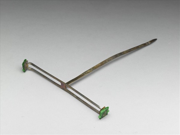 髮飾,T形簪,橫條鍍金銀片作H形,兩端鑲翠玉囍字。素挺,挺上有兩方戳記,「□興」、「足紋」。
