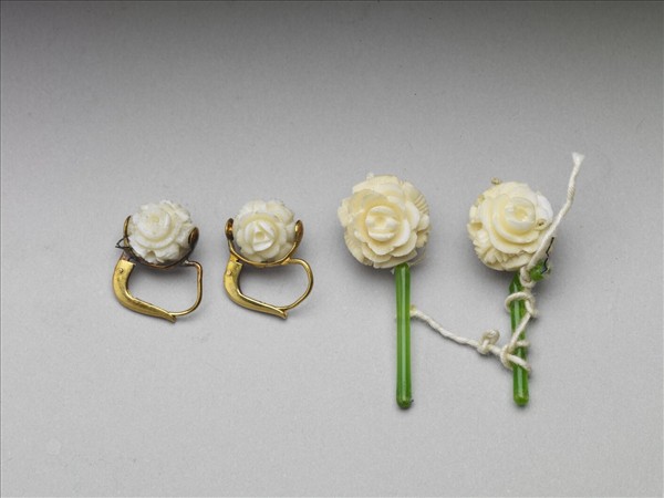耳環,將象牙雕琢成月季花形式,做成兩組飾品,一組連繫玉棒,另一組則鑲以鍍金環扣。清朝婦女的耳飾,分成耳環與耳墜兩類,無流蘇者為耳環。滿族舊風俗中婦人一耳帶三副耳飾,入關後受漢習俗影響,婦女逐漸模仿漢人妝飾,所以也有僅帶一副耳墜的情形。附各類脫落寶石零件包。此器與故雜6753同一組件。