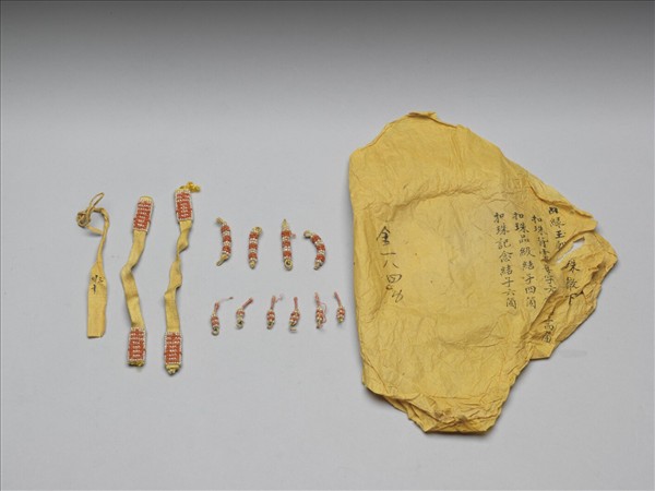 朝珠零件,以珊瑚米珠和珍珠米珠搭配鑲串。附黃色包裝紙,紙上書寫此由綠玉朝珠撤下,分別為扣珠背雲喜字方結子四個、扣珠品級結子四個、扣珠記捻結子六個。