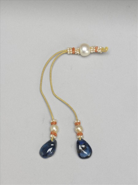 念珠配件,故雜006759-006765同儲一包,以黃絲線串繫,結緝珍珠和米珠為飾,下分兩藍寶石墜角,墜角上結緝珍珠和米珠。