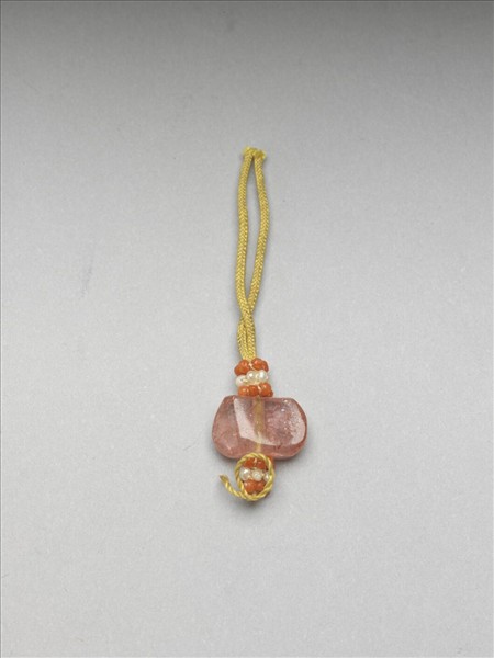 碧璽墜飾,色澤偏粉紅,脫落的零件之一,以黃絲線串繫,上下結緝米珠為飾。