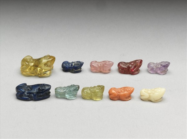 蟾蜍,大小不一,材質各異,本器為圖片中各式蟾蜍的其中一件。故雜6766-6775以及故玉8013-8014,共十二隻蟾蜍同儲一包。